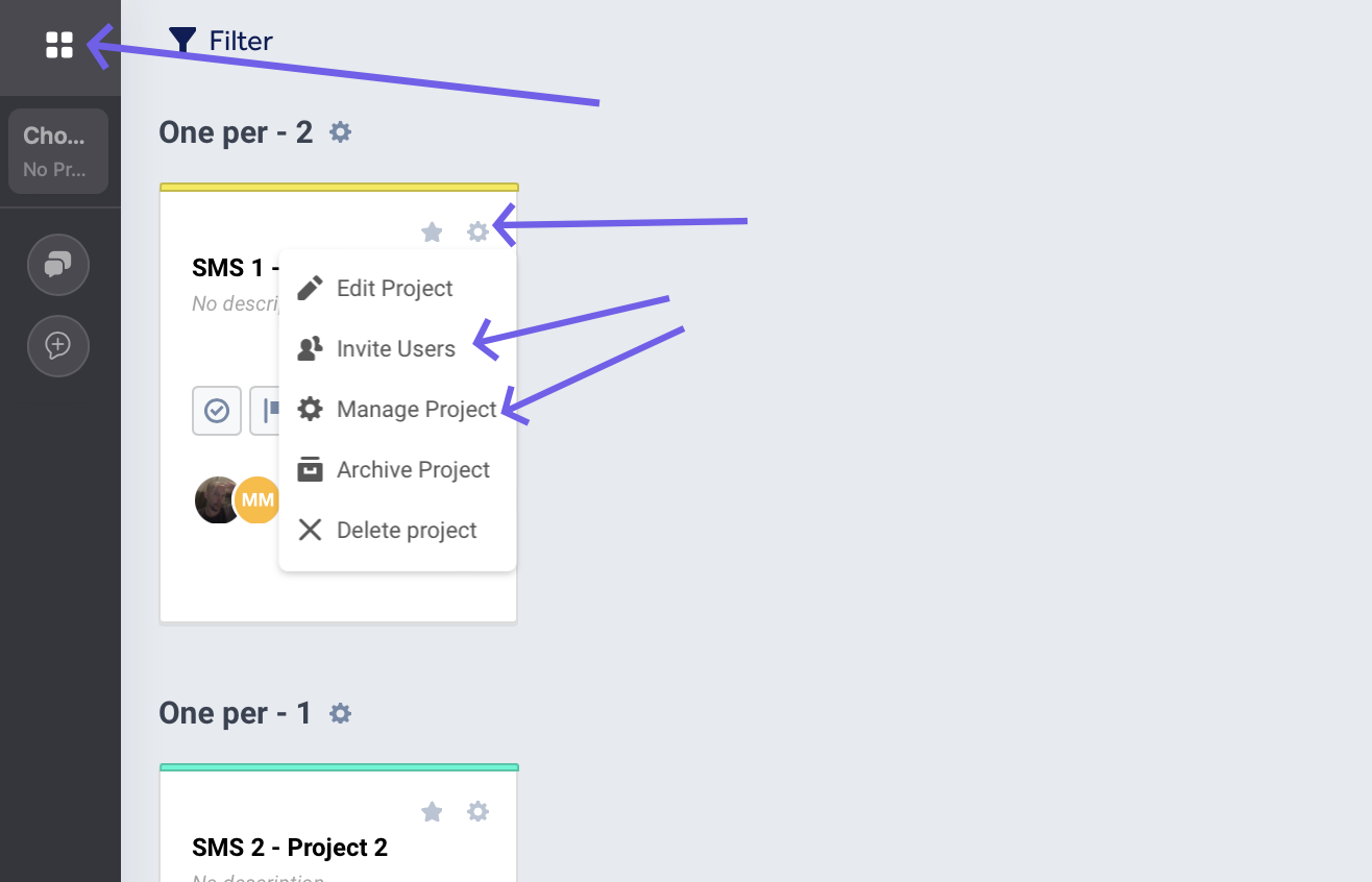 While on the Projects Board you can access the Manage System for a project and the Invite Users wizard from a project card cowheel icon.