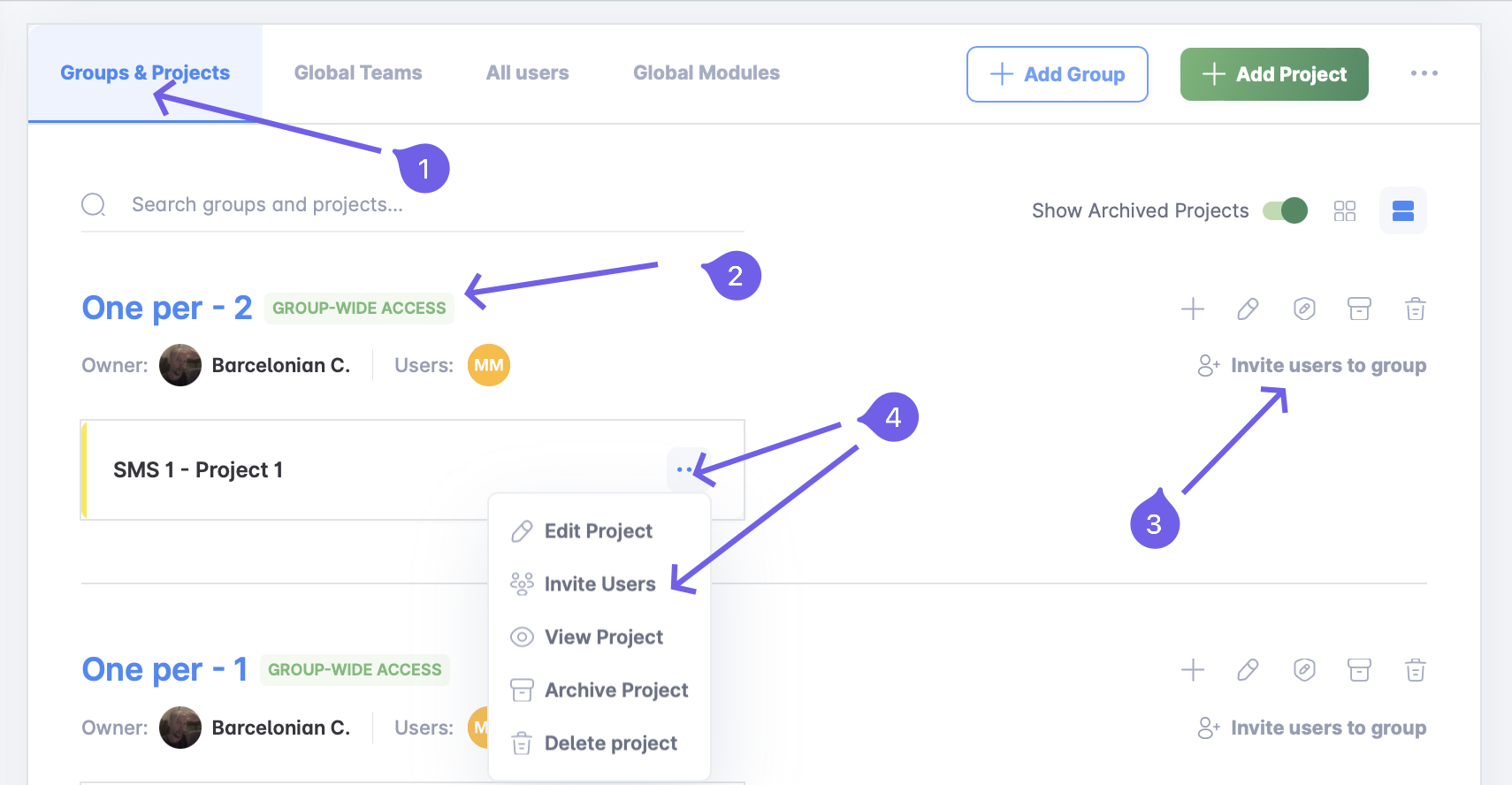 On the 'Groups & Projects' tab (1) for groups using a simple system (2) both (3) and (4) will add new users and allow them to access all projects in that group.