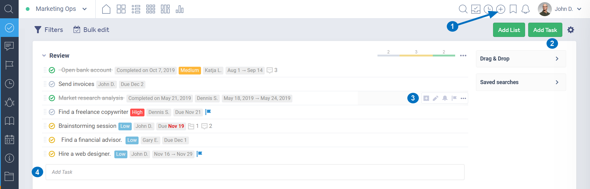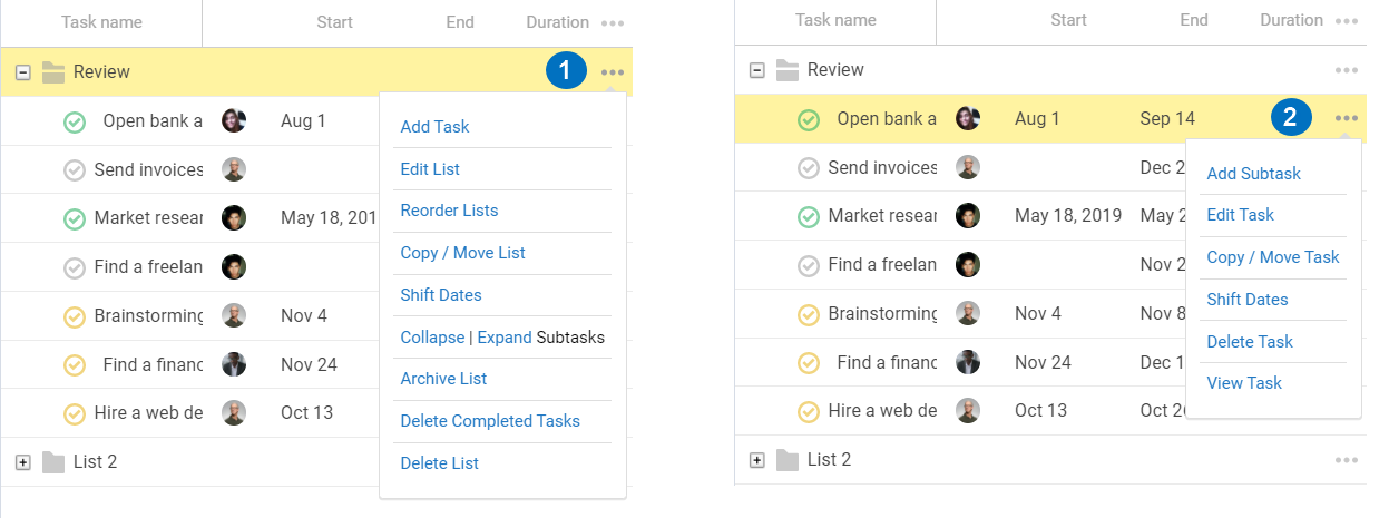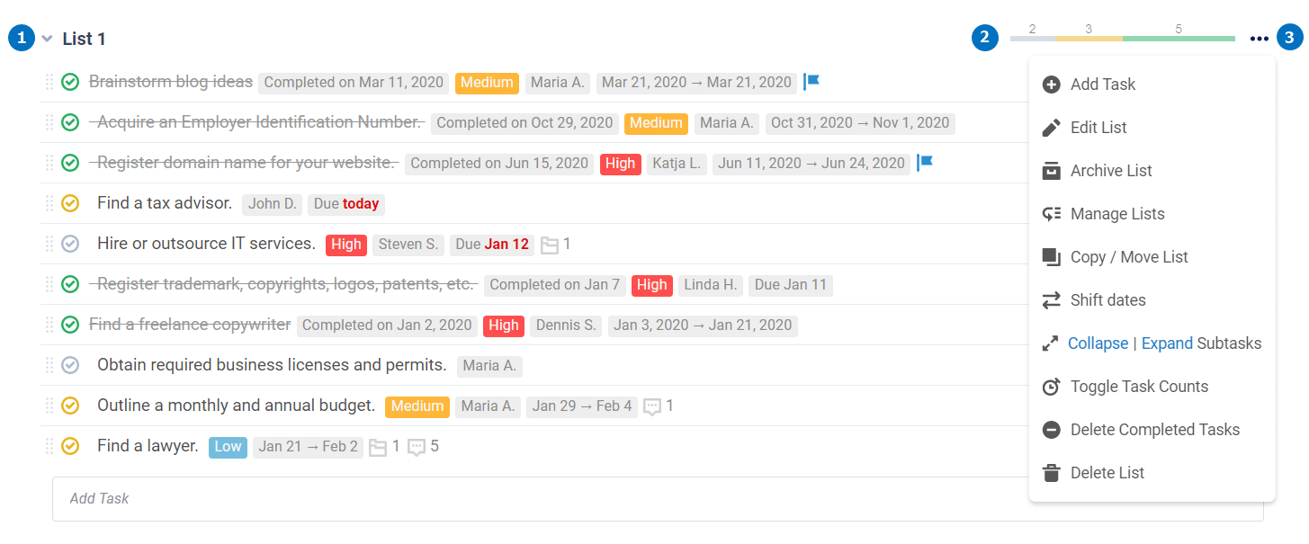 Clicking the 3-dot icon (3) to the right of a task list will show multiple options: Add Task, Edit List, Archive List, Manage Lists, Copy/Move List, Shift Dates, Collapse | Expand Subtasks, Toggle Task Counts, Delete Completed Tasks, Delete List.