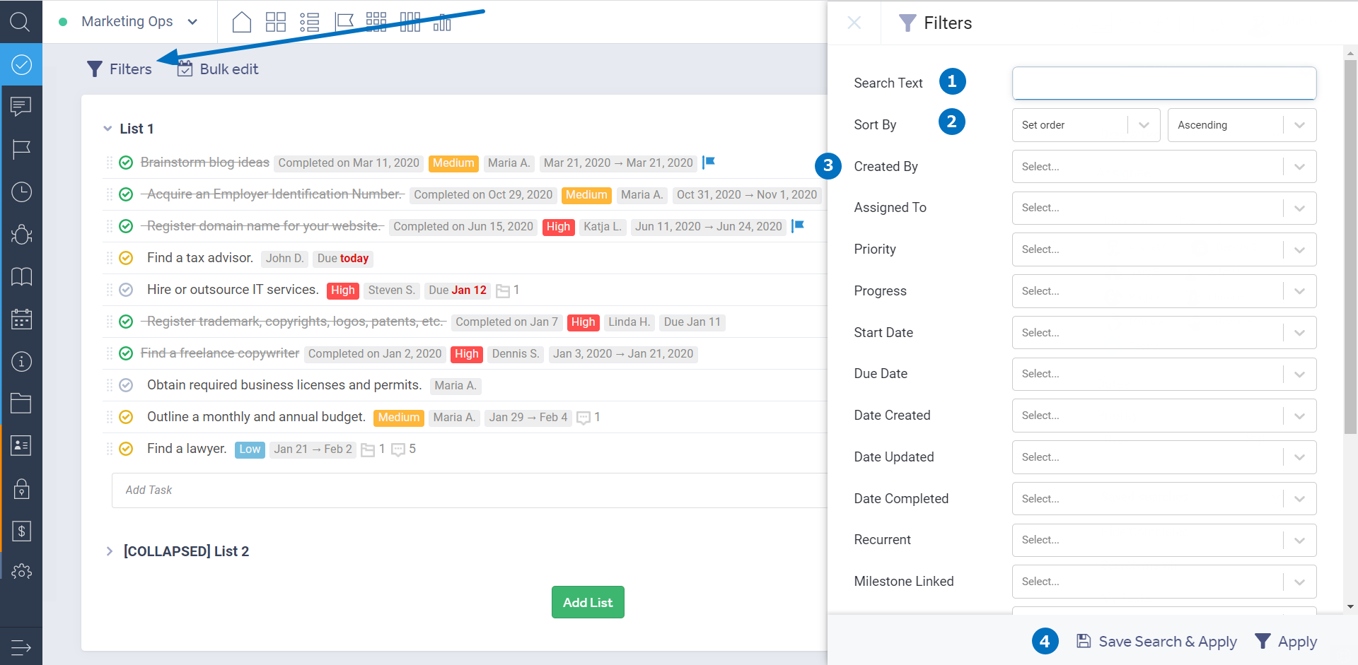 3. Filter by your tasks by a variety of attributes: Created By, Assigned To, Priority, Progress, Start Date, Due Date, Date Created, Date Updated, Recurrent, Date Completed, Milestone Linked, Availability, Tags. Custom Fields will also show in the Filters menu if you applied them to that project.