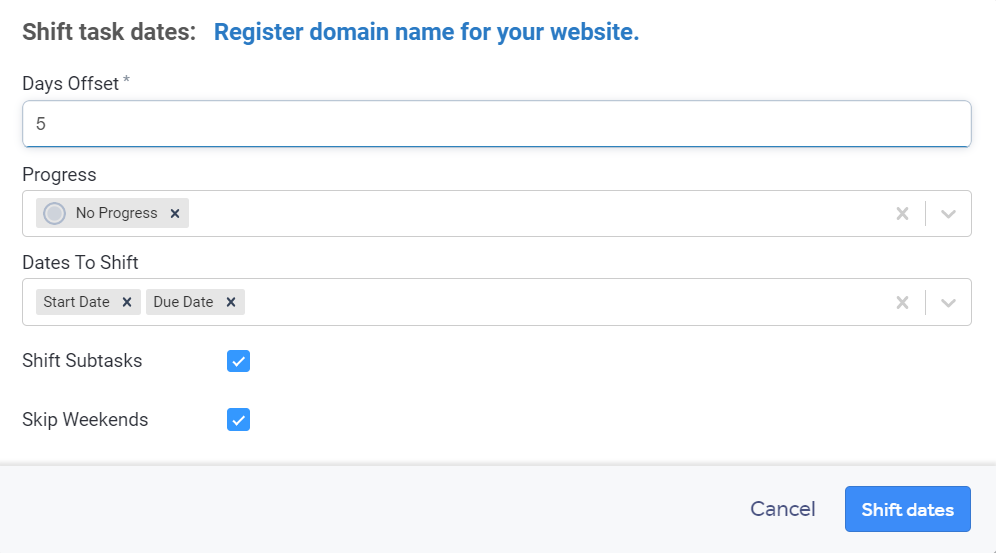You can shift the start and end dates of your tasks by clicking the 3-dot icon of a task and selecting Shift Dates. Doing this to a task will also change the dates of its subtasks.