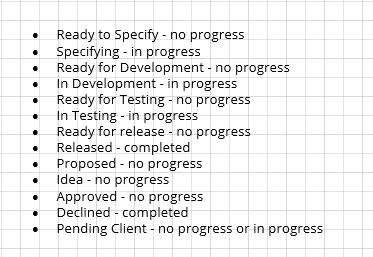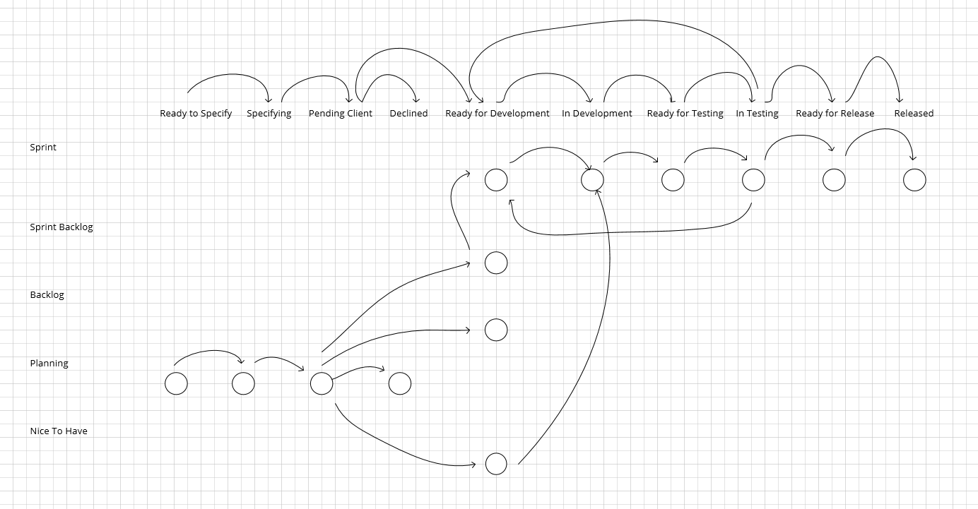 For example tasks in the Planning task list will typically flow only between statuses - Ready To Specify to Specifying to Pending Client approval to Declined. If a client-approved it a task will be moved into Nice To Have list, Backlog, Sprint Planning or Sprint depending on the priority of the task.