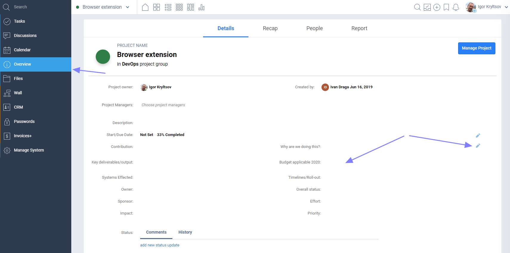 This module is available on the Enterprise plan. You need to have the Project Overview application added to your projects to allow your users to access and update custom fields for projects.