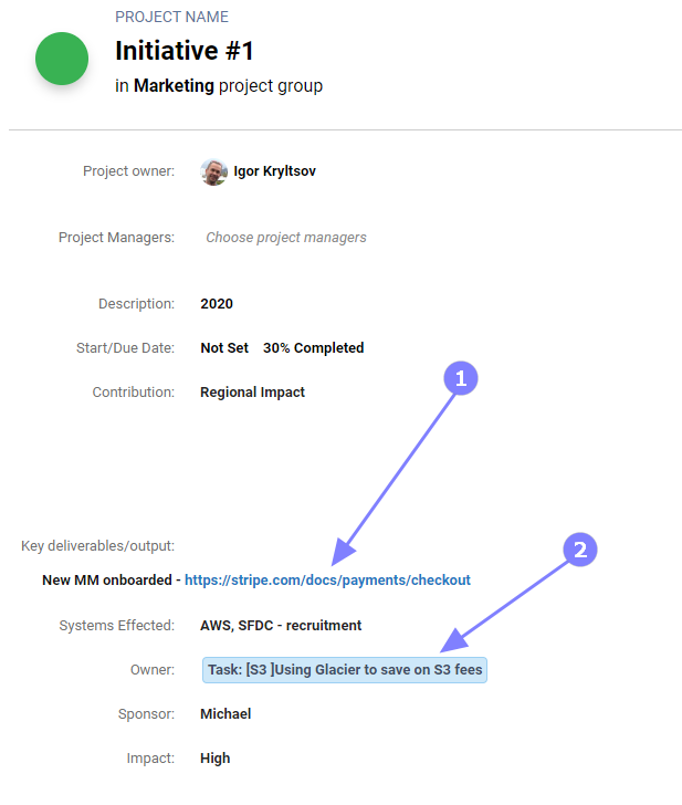 When URL is used inside input or text box fields, it will be parsed and shown by Freedcamp as a clickable link (1). Internal Freedcamp links will be automatically converted to smart links (2):