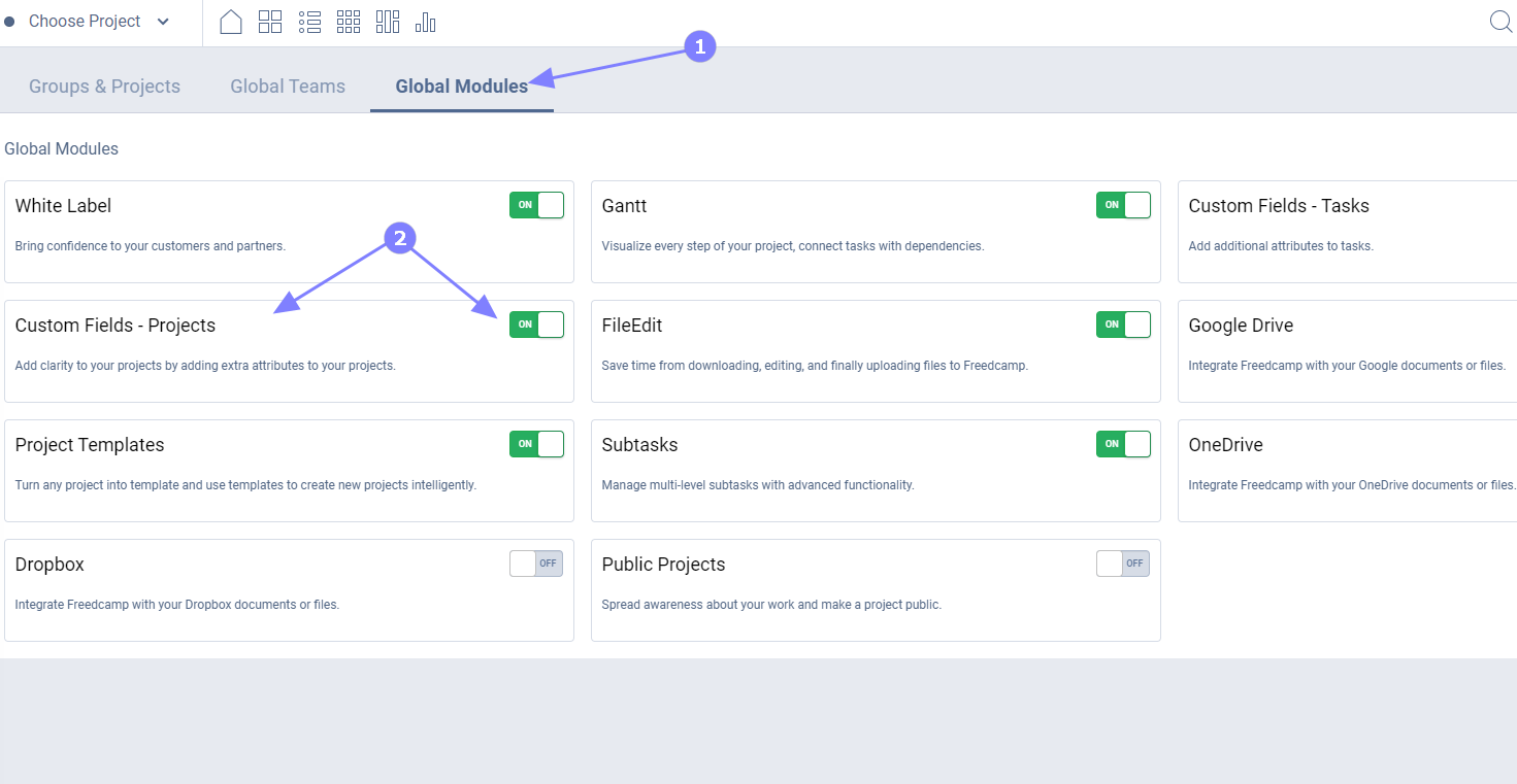 - enable/disable the 'Custom Fields - Projects' module