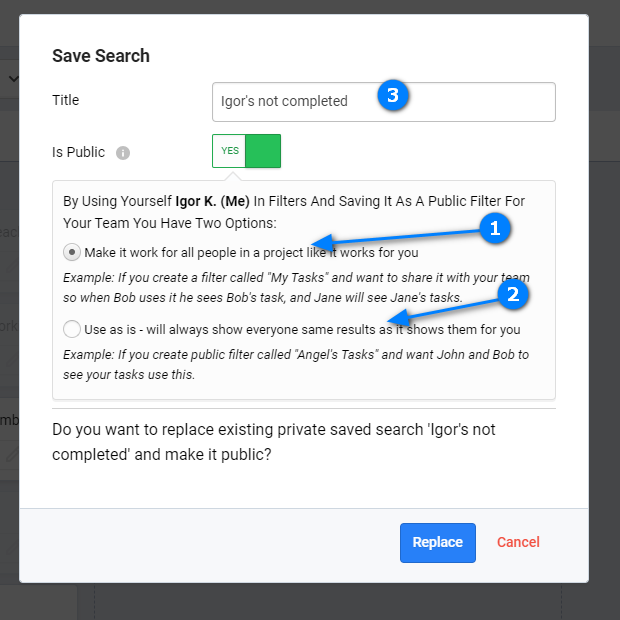 When making a saved search available to your team in a project Freedcamp will detect if only one person is selected in Assigned to or Created By and will give you two options: