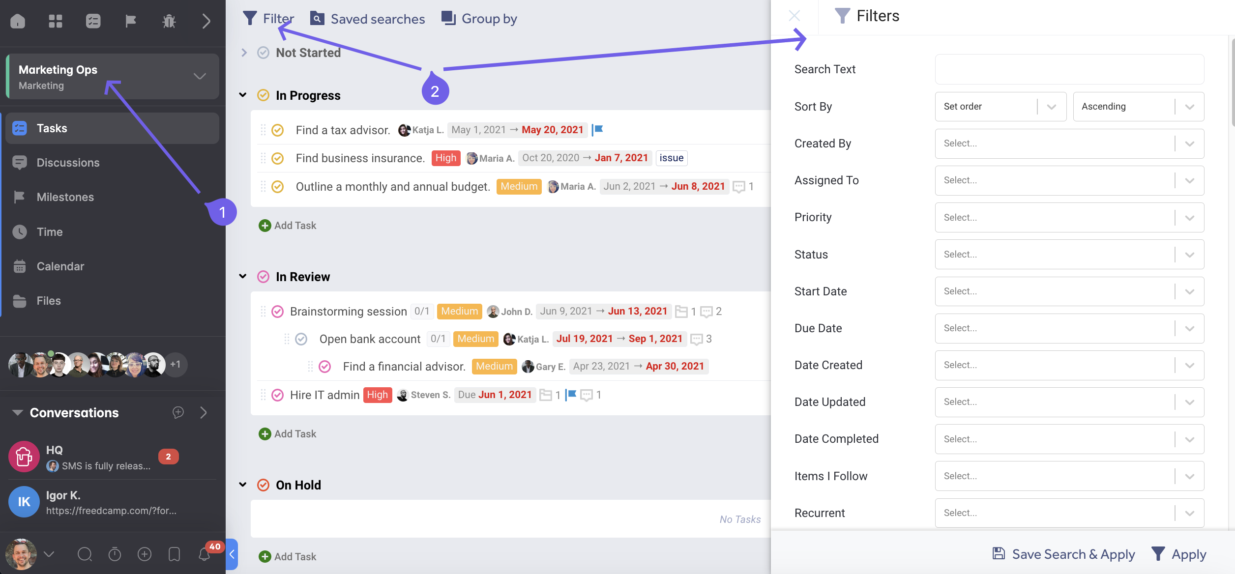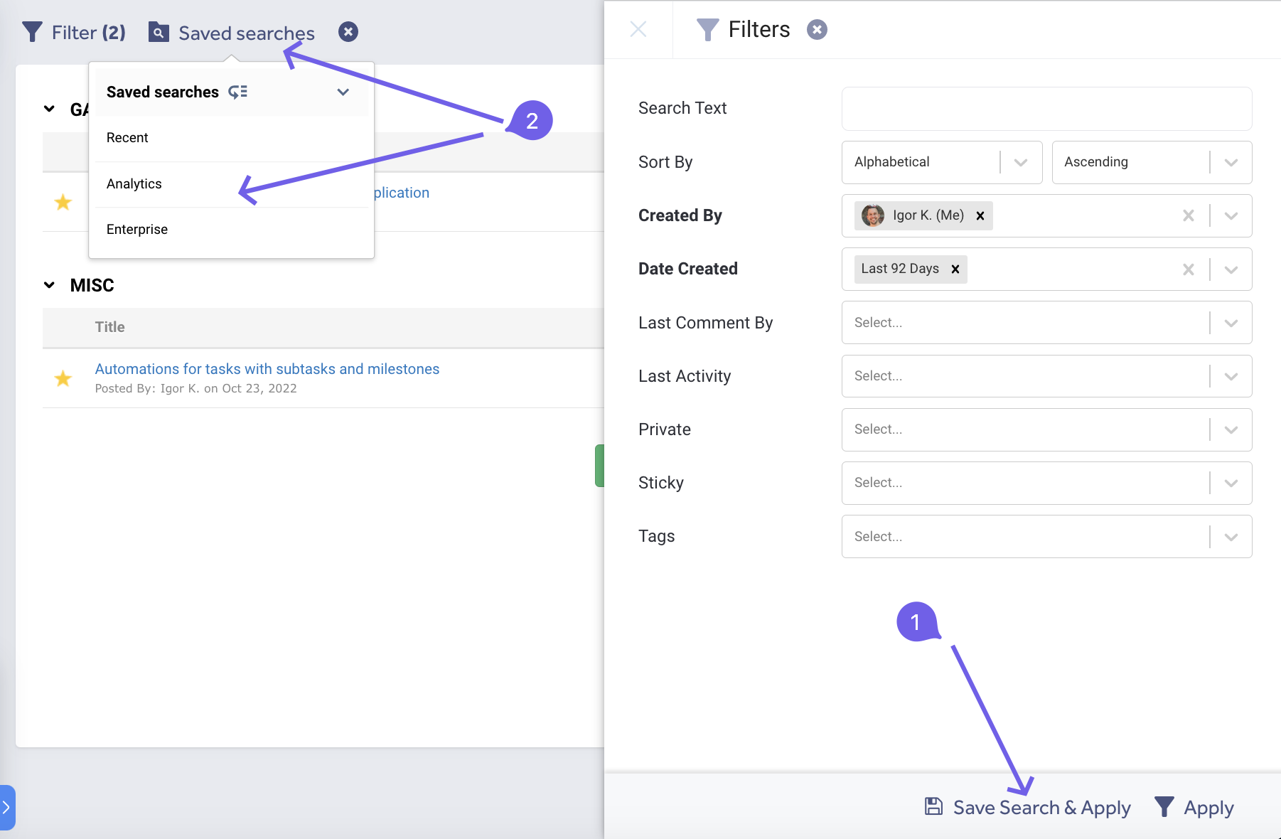 Each application such as Tasks, Milestones, Issue Tracker, Files etc. inside a project (1) has its own filter/sort capability (2):
