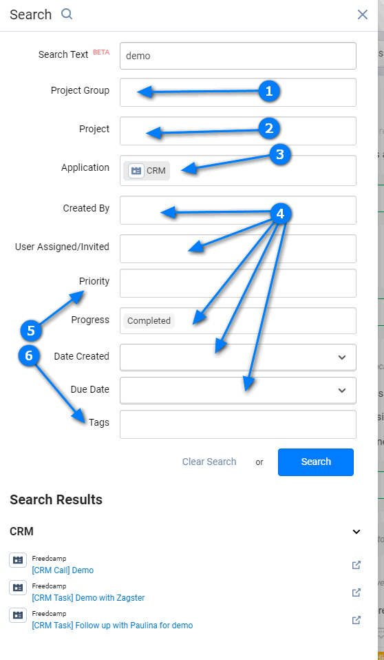 CRM is the first project group application that is supported in Freedcamp's global search. You can search for your CRM tasks and calls, but not campaigns or contacts yet.