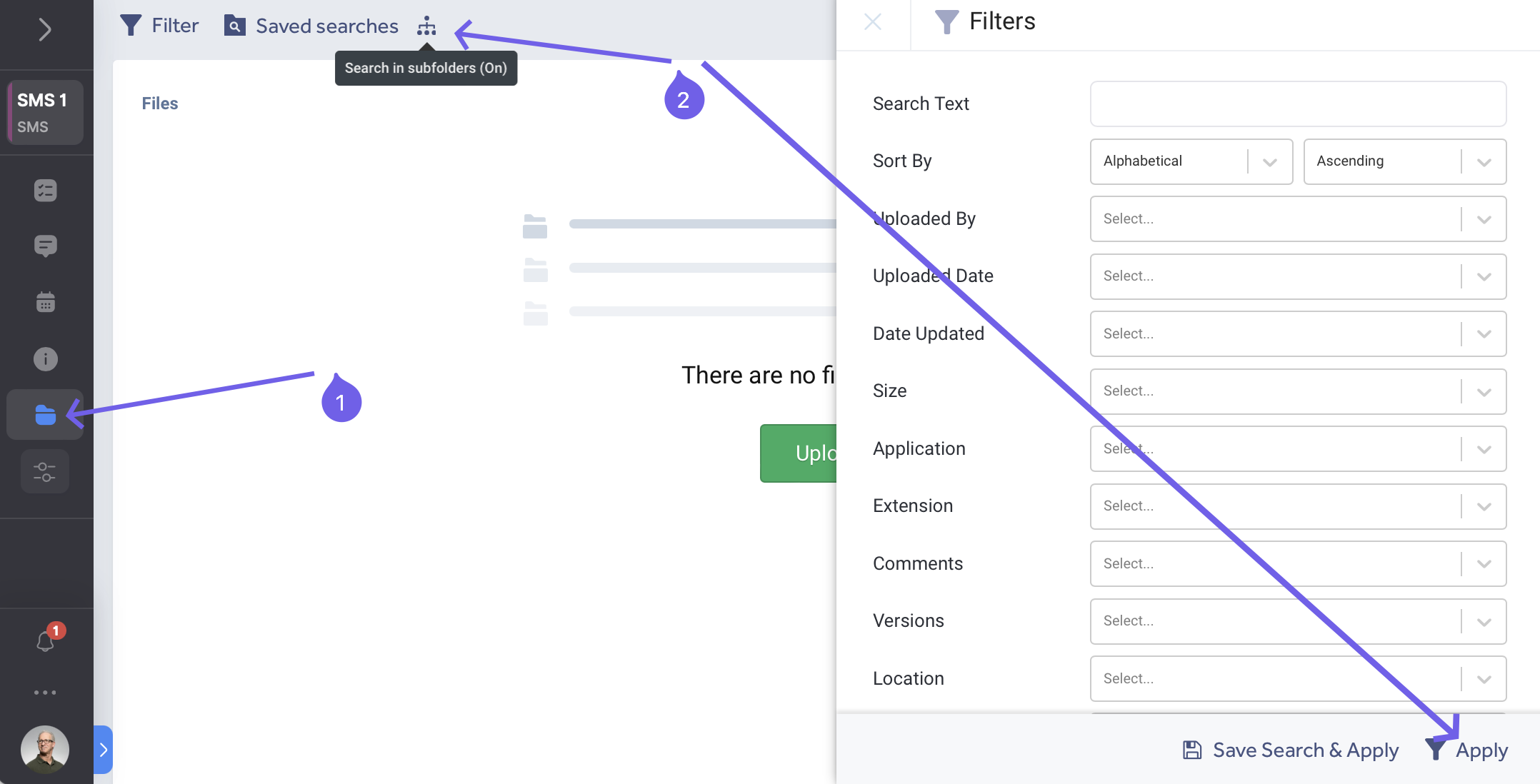 In the 'Files' application (1) an additional toggle (2) 'search in subfolders' can be turned on/off before or after applying filters.