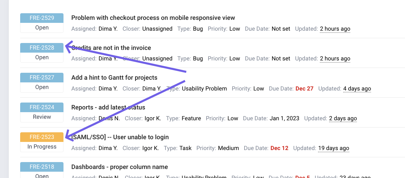 - issues that have an internal Freedcamp number (you see it in the URL on the issue page). For example for an issue https://beta.freedcamp.com/Clever_High_School_gLs/Cost_Control_ohu/bugtracker/view/5545 you can find it by typing 5545