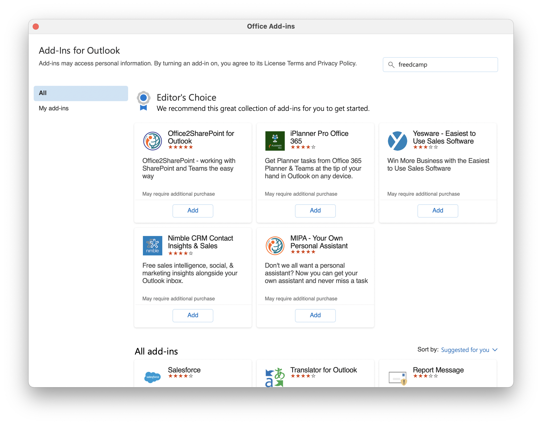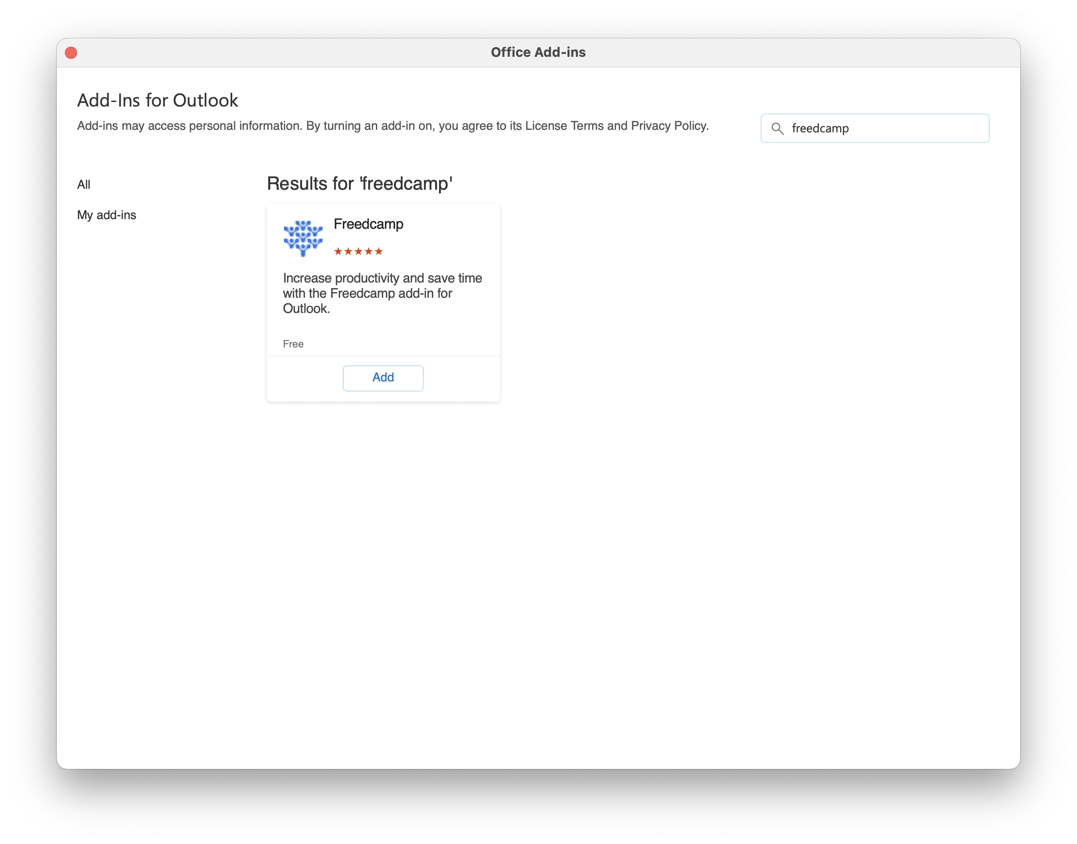 From the Add-Ins dialog, type "Freedcamp" and press "Enter".