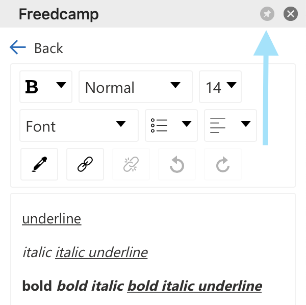To pin the add-in press the "Pin" button in the top right corner.