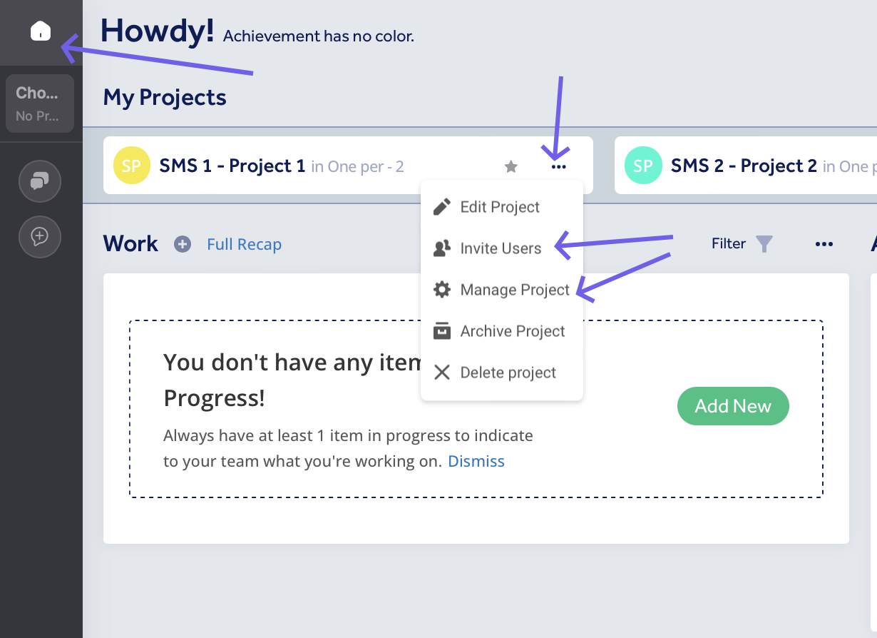 While on the Projects Board you can access the Manage System for a project and the Invite Users wizard from a project card cowheel icon.