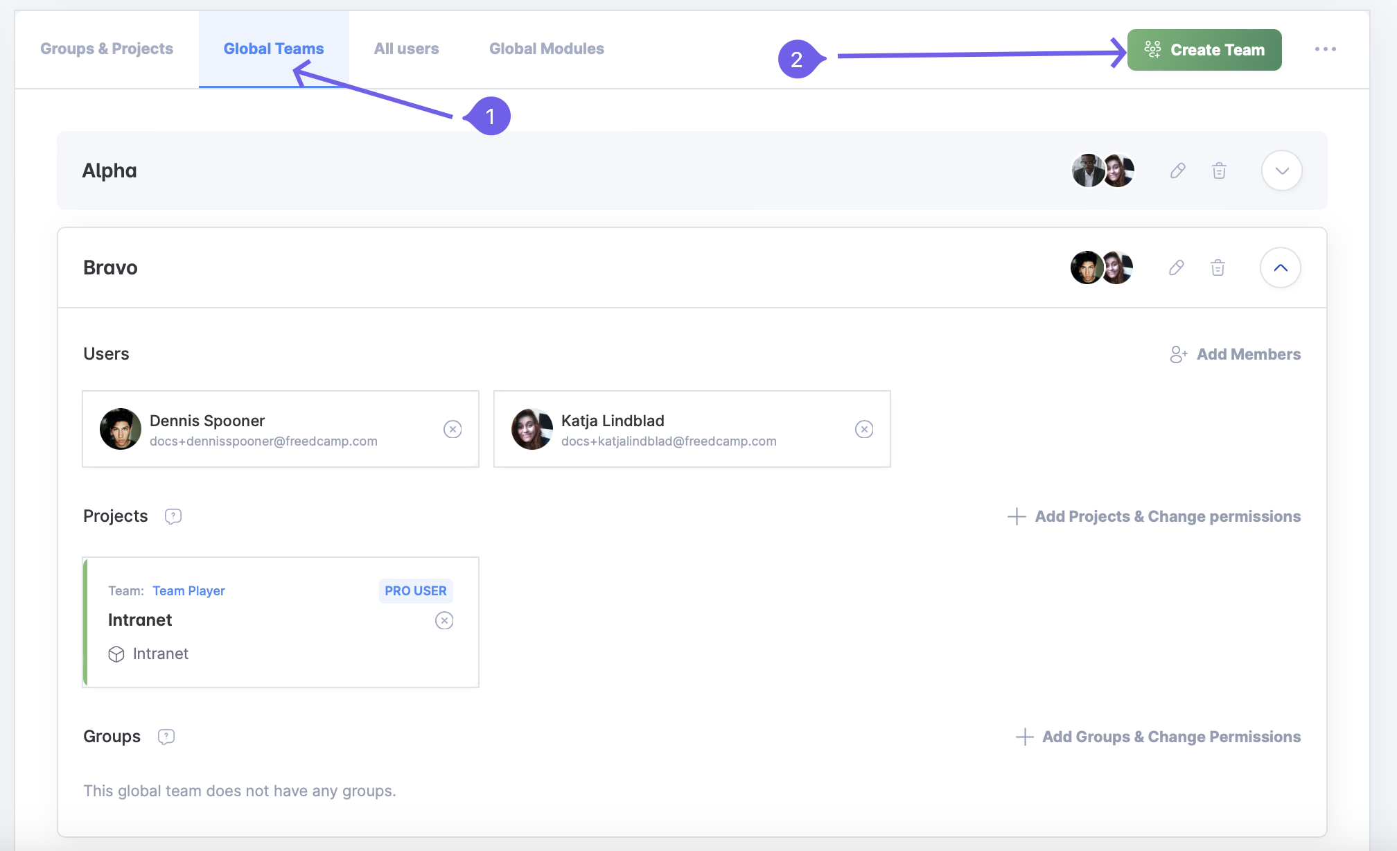 As an owner, you can manage Global Teams by going to the Manage System Global Teams tab (1). You will be able to create a team (2), edit and delete existing teams, add members and manage what projects a team is a part of and their permission level for each project.