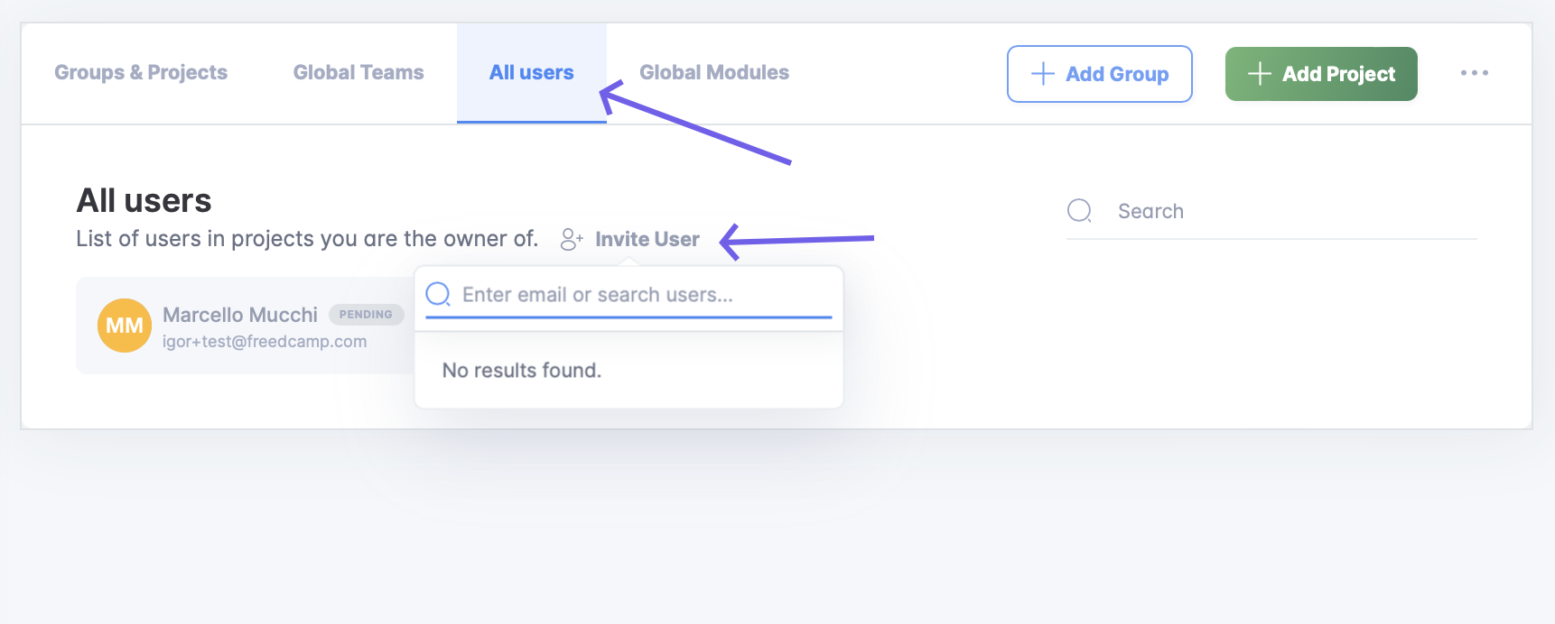 The 'All Users' tab is not to be confused with the Global Teams one. It lets you see and manage users across all of the projects that you own.