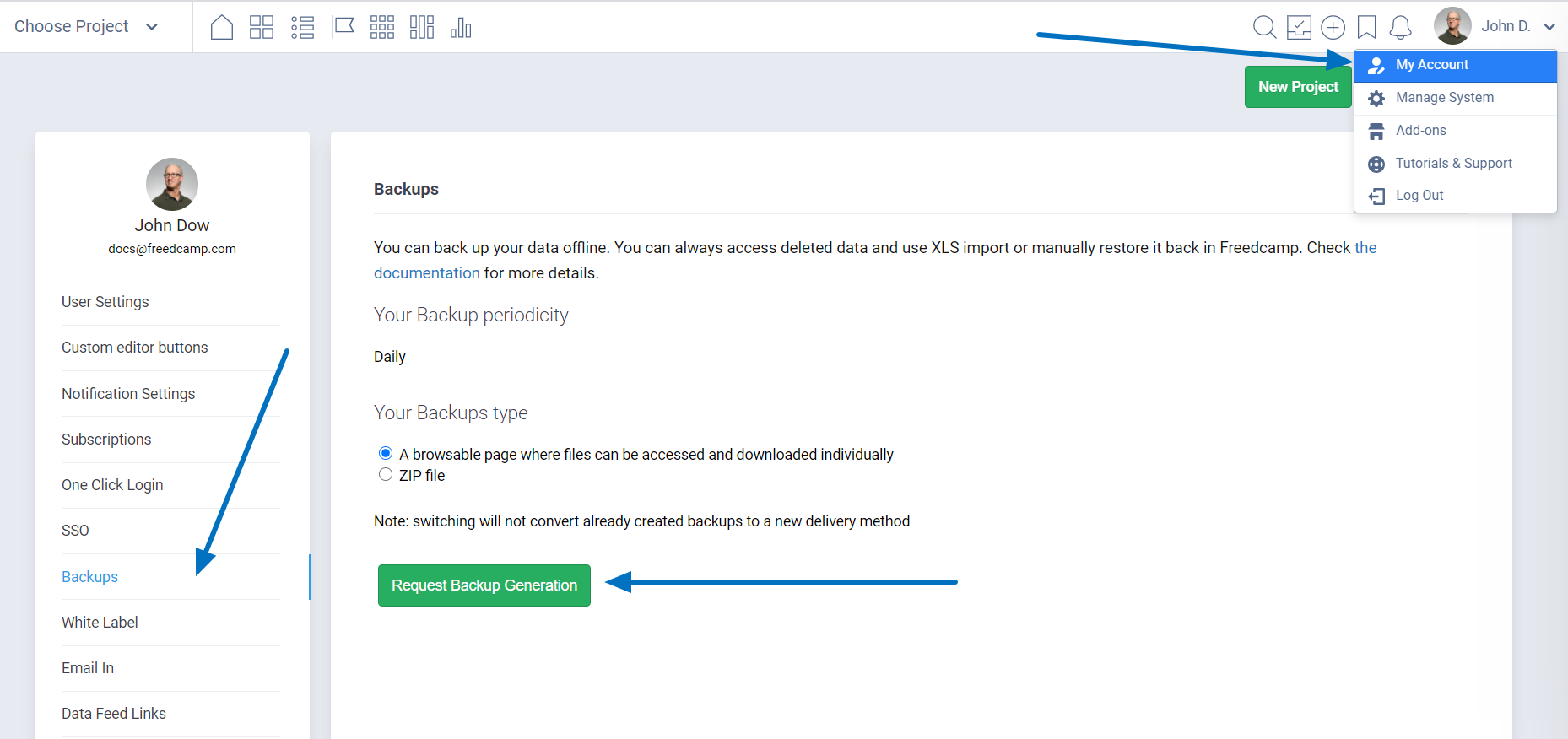 Note: Backups we provide cannot be restored automatically but only are structured data you can access to reimport to Freedcamp via XLS import or by copy/pasting backup data back to Freedcamp.
