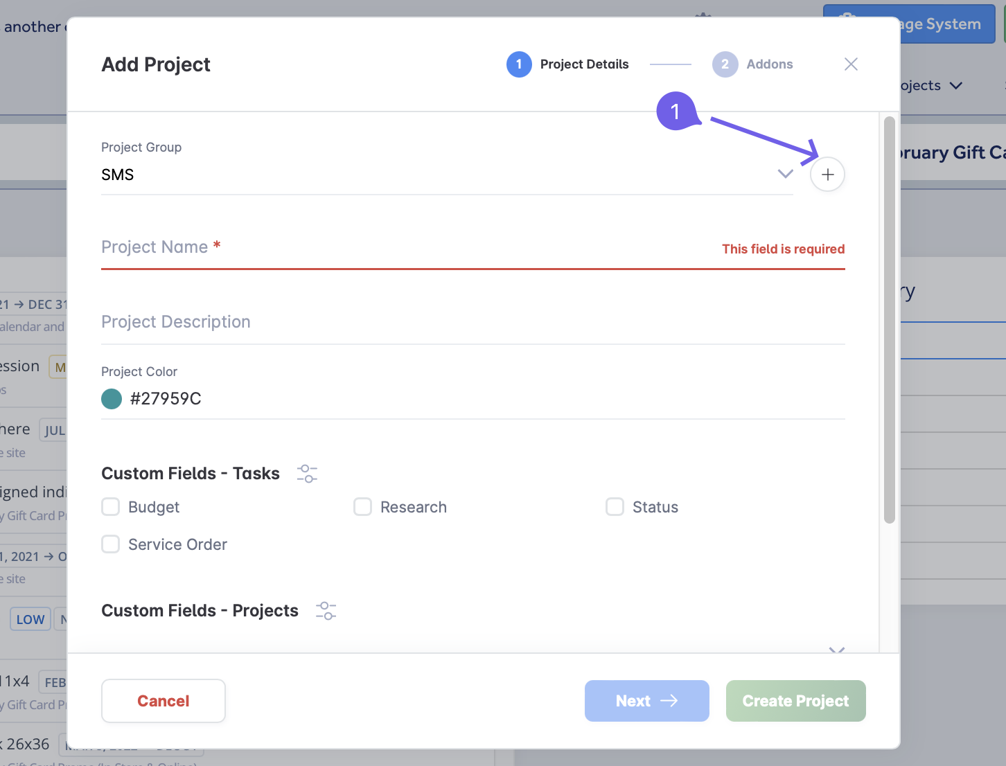 The project creation form allows you to set your project's name, description, colour, custom field templates and project group.