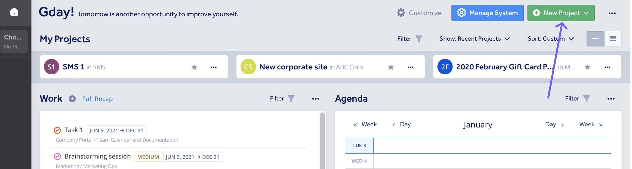 You can create a new project from the Homepage, the Projects Dashboard, the Widgets Board, or the Manage System page.