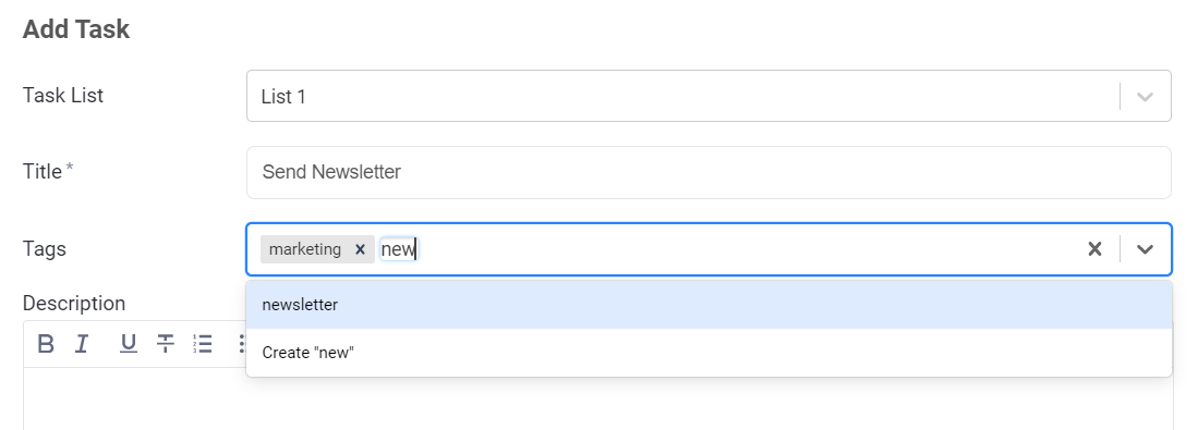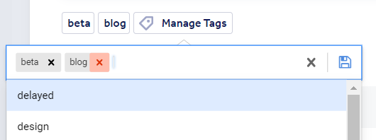 Once the tag field appears, you can click it to see all available tags. You can choose tags from the list by clicking them, or using the keyboard arrows + enter. Typing in the tag field will show you available tags that match the text, or the option to create a new tag with that name.