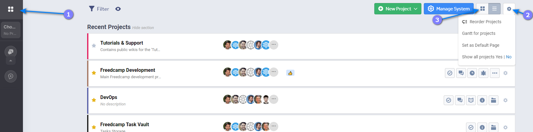 To access the Projects Board click this icon (1) in the navigational panel. Use the cog wheel icon (2) to access extra options. The 'Show all projects' will expand groups with a lot of projects instead of collapsing some of them to 'Click to see more'. The toggles (3) allow you to switch this board from cards (default) to list view.