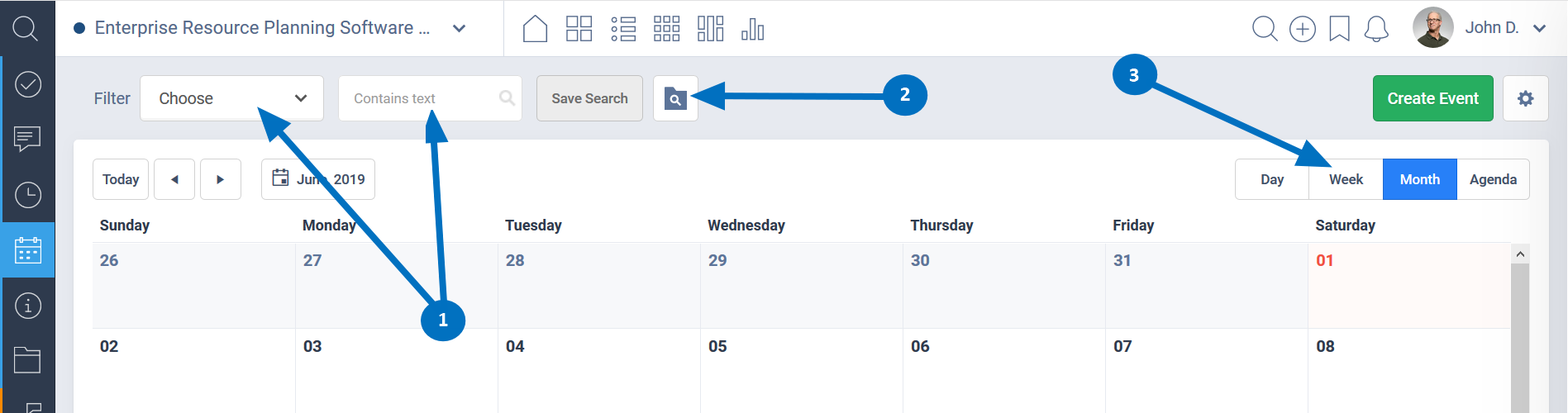 The filter menu (1) allows you to filter your Calendar items by application (Tasks, Events), Creator, User Assigned To, Priority, Progress, Date Created and Tags. Searches can be saved for later use by clicking the Save Search button (2).