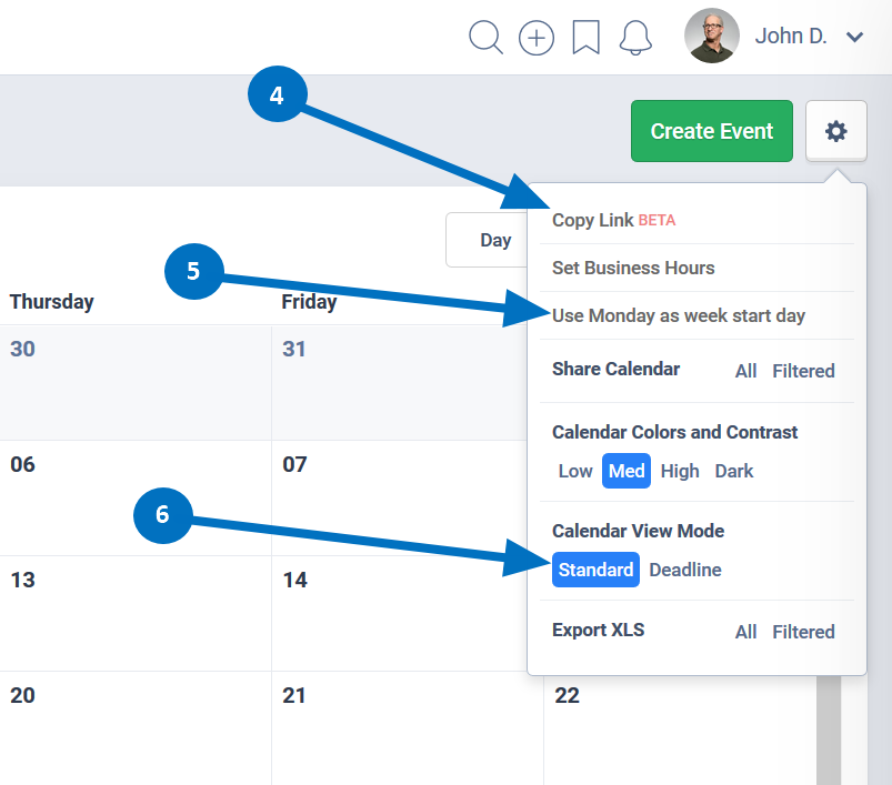 You can also change the default start day of the week from Sunday to Monday(5) and switch between Standard and Deadline views(6).