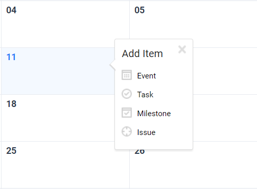 All items with a date can be created and managed from the calendar: Events, Tasks, Milestones, and Issues. To add a new item, click on the desired due date and select the type of entry you want to add. A new window will pop up where you’ll be able to add all the details like the title, description, assigned users, and priority level.