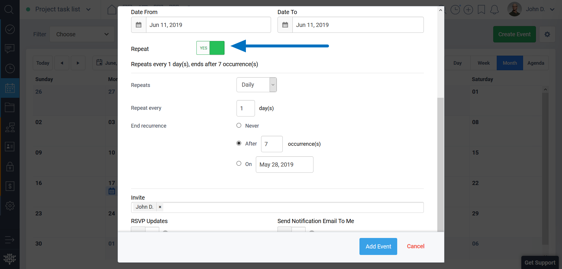 Adding a recurring event is almost the same as adding a normal event. You have to click on the desired due date(or start date in this case) and select “Event” in the Add Item menu. The only difference is that after filling in all the details, you’ll have to also tick the “Repeat” box then choose the occurrence rate and the duration.