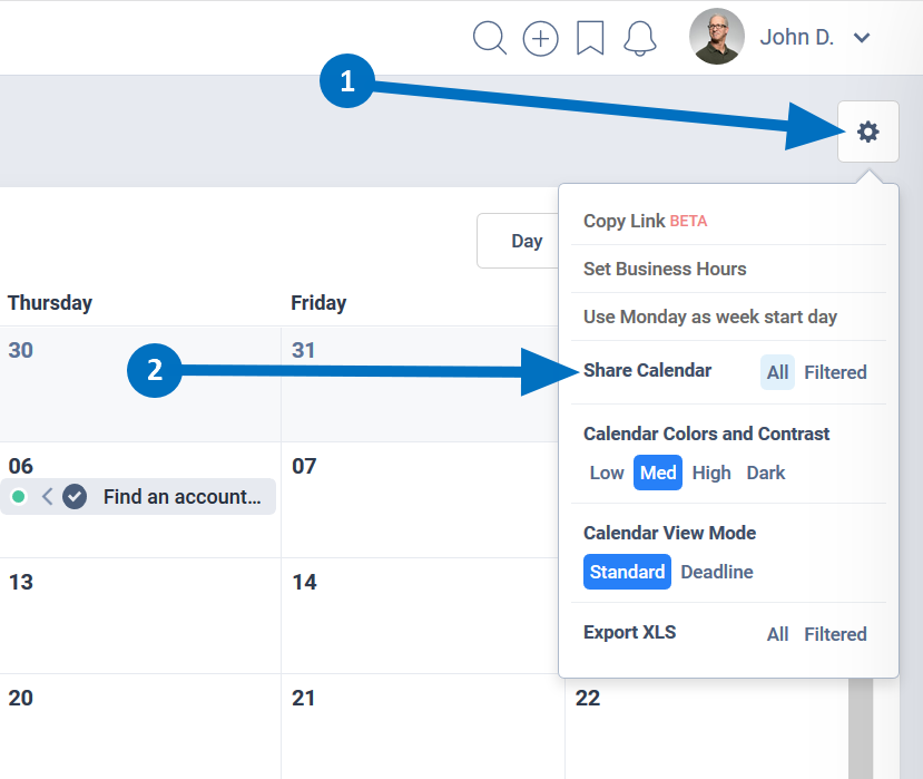 - Go to the Share Calendar option and select All or Filtered, depending on your preferences(2).
