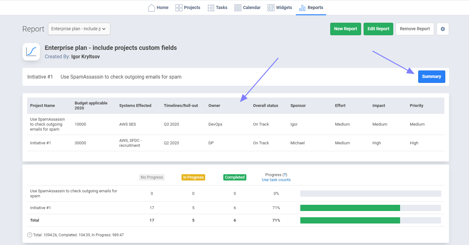 - Access special section in Freedcamp Reports 'Summary' section to see custom field values for a portfolio of your projects.