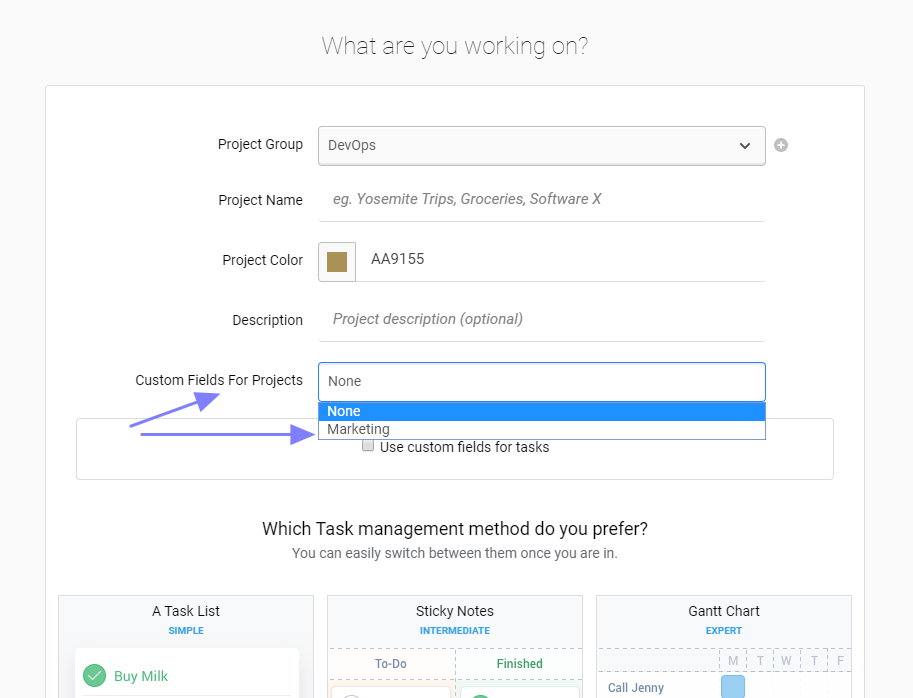 - Running different types of projects – 'Marketing', 'Development', 'Design'? We thought about it too – create 3 templates with required fields. Simply select the 'Marketing' template while creating your next marketing project and all fields will be applied.