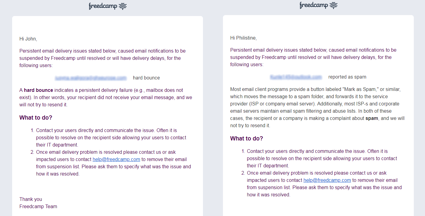 – An email message is too large – this should never, however, be the case with Freedcamp since we do not send attachments and cannot exceed the size quota for this reason