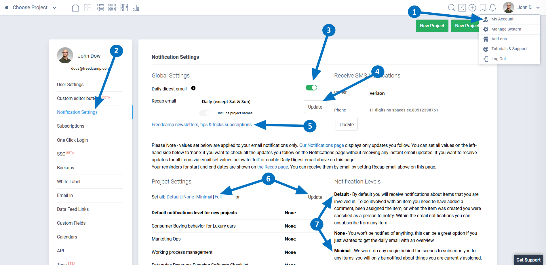 (6) Project notification levels - you can set one for each project, as described in section (7), as well as set a level for all projects you are a part of.